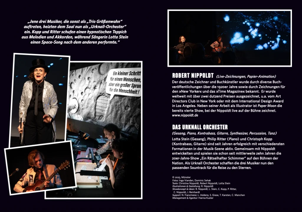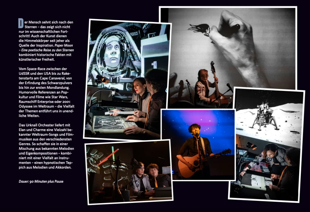 Ein Blick in den Nachthimmel – und plötzlich ist da diese Sehnsucht. Nach dem Unbekannten, nach Weite, nach Träumen, die schwerelos durch das All schweben. Paper Moon nimmt Sie mit auf eine faszinierende Reise dorthin, wo Vorstellungskraft und Kunst eins werden. Lassen Sie sich treiben – zwischen Vergangenheit und Zukunft, zwischen Wissenschaft und Poesie, zwischen Erde und Unendlichkeit. Ein Abend voller Nostalgie, Staunen und Sehnsucht nach den Sternen – humorvoll, poetisch und einzigartig!